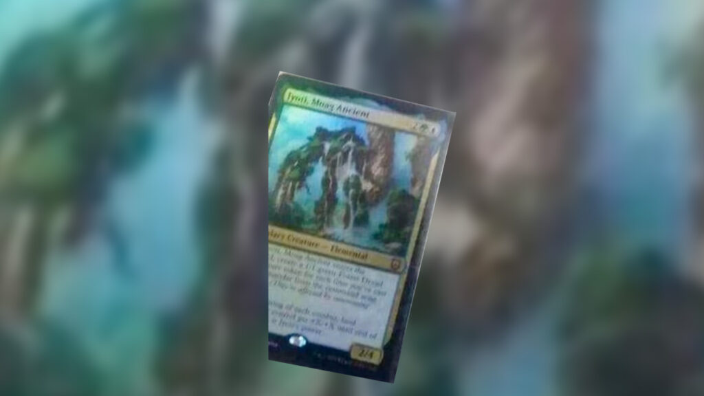 Another impossibly illegible card, Tyoti, Muag Ancient appears to create, basically, Dryad Arbors. Here’s what the Reddit translation suggests that it does: