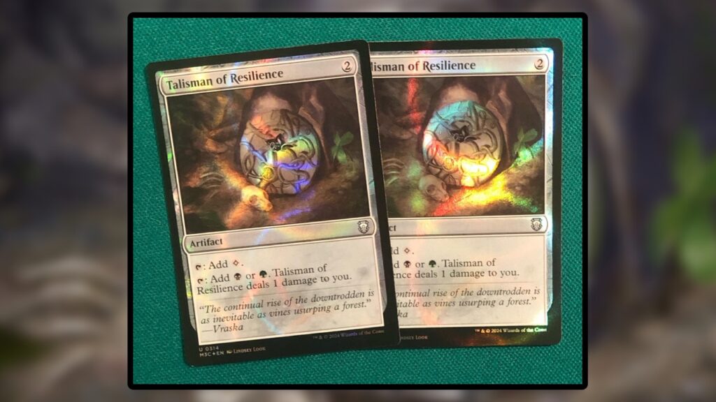 I mentioned above that looking at errors like these through a financial lens is a mistake, but there are exceptions to that. Case in point: the same printing error on one of the prestigious MH3 ‘Collector’s Edition’ Commander decks. Reddit user Mlgmanyuji reported exactly that, showing off a pair of shiny Talisman of Resiliences for all to see.