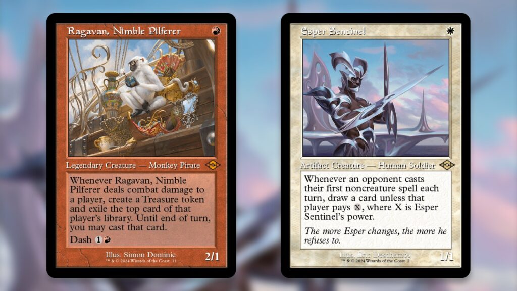 There are 16 Retro Frame Reprints in Modern Horizons 3, but two stick out like sore, old-school thumbs when you look through them. I refer, of course, to Ragavan, Nimble Pilferer and Esper Sentinel.