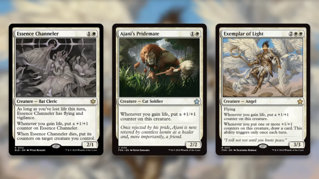 Ajani’s Pridemate and Essence Channeler are the big ones. These are both two drops that scale up as you gain life, easily becoming huge threats in a deck like this. Curving Sanctifier or Feast into one of these is the dream, since they’ll each get a counter right away. Channeler is pretty much never going to gain Flying and Vigilance in this deck, but it does get to pass on its counters after death, which is huge.