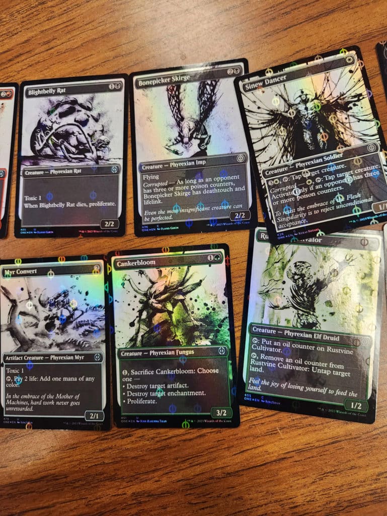 By releasing a very early look at Phyrexia: All Will Be One, Wizards accidentally confirmed PeterboroughPro’s leaks featured the correct set symbol, as well as Set Code. PeterboroughPro’s leaks also feature the new Step-and-Compleat foiling technique that Wizards recently showed off. Subsequently, it appears that these leaks are genuine Phyrexia: All Will Be One cards.