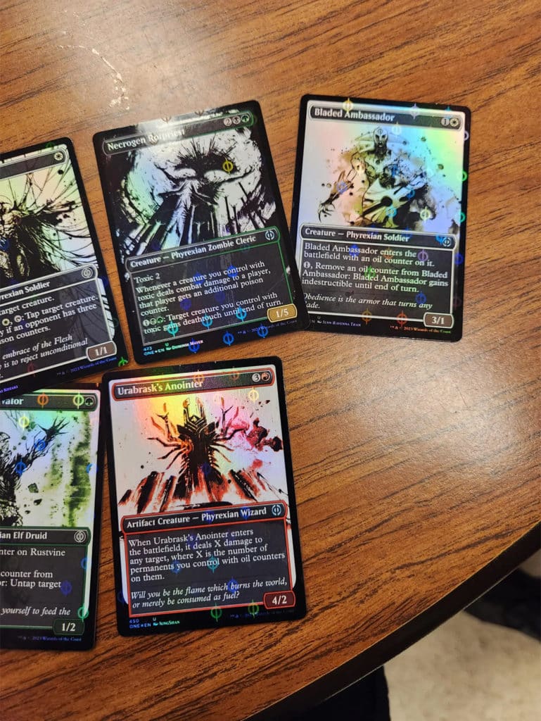 Following several of the leak’s details being confirmed, MTG players understandably had a renewed interest in PeterboroughPro’s leaks. Specifically, many MTG players were enamored with the pile of extra cards that were visible but not being shown off. Excited players obviously hoped they’d see these presumed spoilers soon, however, mysteriously, PeterboroughPro deleted their leaks from Reddit and then disappeared. After months of silence, PeterboroughPro has recently reappeared once again, this time showing off their remaining Phyrexia: All Will Be One spoilers.