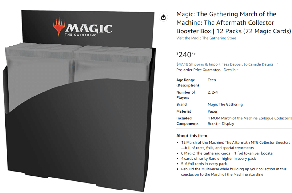 Pictured above are the details for the March of the Machines: The Aftermath Collector Booster Box as they appear on Amazon. For $240.75, you receive 12 Collector Boosters, which seems normal with other Collector Booster releases. Strangely, these Booster Packs only contain six Magic: the Gathering cards and one foil token. Four of the cards included will feature a Rare or higher rarity.