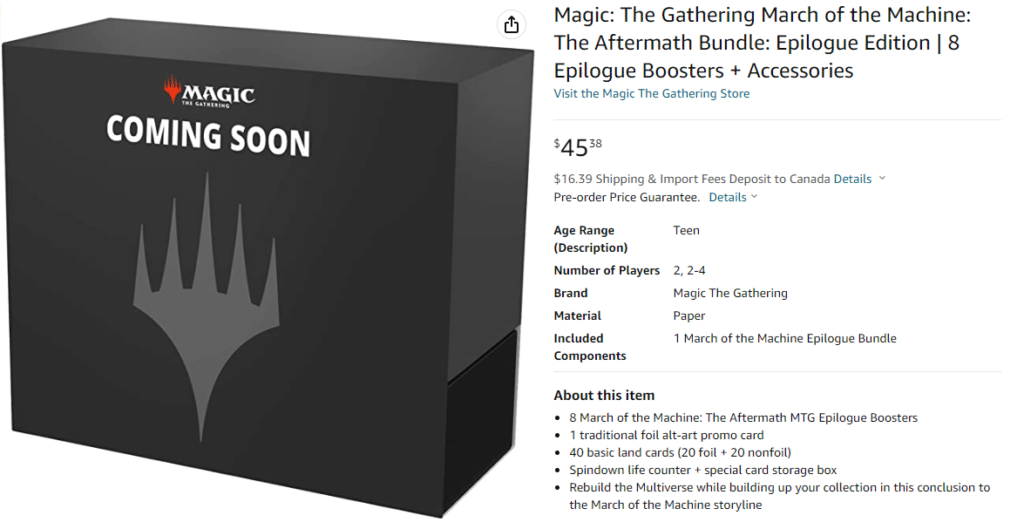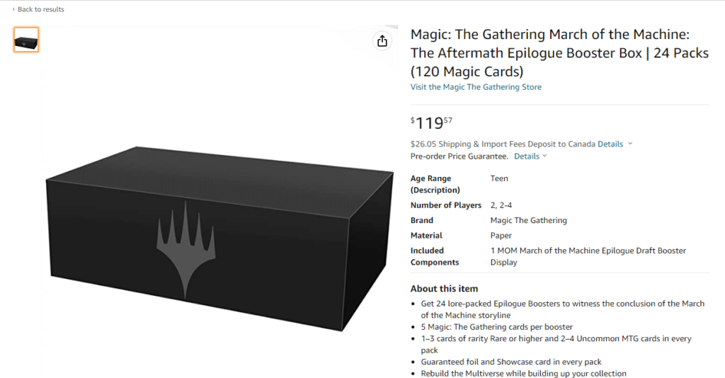 Pictured above is the March of the Machine: The Aftermath Epilogue Booster Box, as seen on Amazon. For $119.57, you can access “24 lore-packed Epilogue Boosters to witness the conclusion of the March of the Machine storyline.” These Epilogue Boosters contain five cards each. one to three of those cards will have a rarity of Rare or higher, while the other two to four cards will be Uncommon. There is a guaranteed foil and Showcase card in these Epilogue packs.