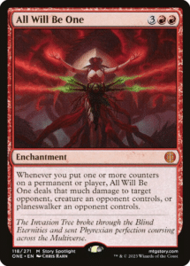 All Will Be One already enables a disgusting amount of infinite combos, and Ob Nixilis, Captive Kingpin, just adds to that list. When Ob Nixilis gains a counter, All Will Be One will deal a damage to an opponent which will trigger the Kingpin again. Rinse and repeat.