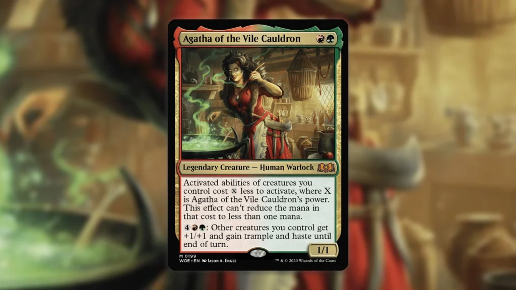 For just two mana, Agatha of the Vile Cauldron offers a lot of utility, thanks to providing a discount on activated abilities. At a baseline, all activated abilities of creatures you control, including Agatha’s, cost one less to activate. If you put in some work, though, these abilities can end up costing next to nothing.