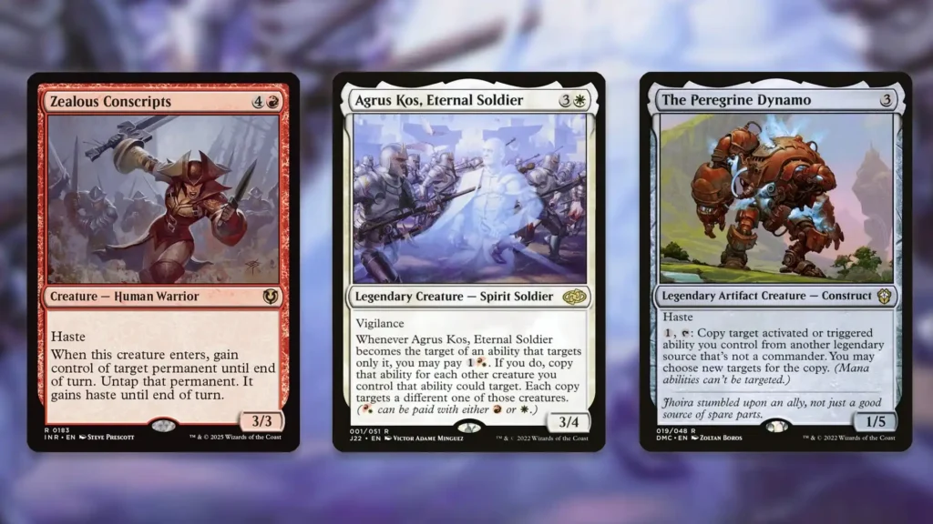 If winning the game by creating a wide board isn’t powerful enough for your table, Agrus Kos also has a few game-winning infinite combos. So long as you have mana dorks that can generate four mana, Agrus Kos, Zealous Conscripts, and The Peregrine Dynamo can win the game by creating infinite mana.