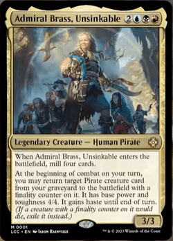 The Pirate-themed Commander deck comes equipped with three solid options to be your general. Admiral Brass, Unsinkable is the primary Commander, and has been revealed for a little while. The card is quite strong, allowing you to return Pirate Creatures from your graveyard to the battlefield as Hasty 4/4s. Being able to bring back cards like Dockside Extortionist with excellent enters-the-battlefield abilities on each of your turns can be quite strong.