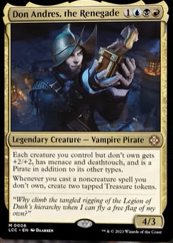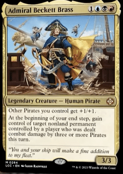 We also have a reprint that also works exceptionally well with Don Andres. Admiral Beckett Brass lets you steal opposing non-Land permanents so long as you can connect in combat with three or more Pirates. Admiral Beckett Brass is a solid Commander option, and almost certainly makes the cut whether it is used as your general or simply among your other 99 cards.