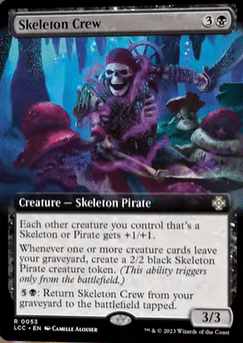 Skeleton Crew is a unique Pirate Lord that benefits you whenever Creature cards leave your graveyard. This, of course, includes Admiral Brass’s reanimation ability. The synergy these new cards provide for the new Pirate Commanders is super cool.