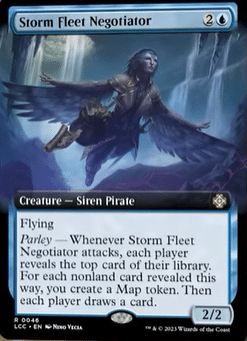 Beyond just the reanimator subtheme that Admiral Brass, Unsinkable provides, this Pirate-focused Commander deck also has a small Artifact theme to go along with the natural usage of Treasure tokens by Pirates. Storm Fleet Navigator, for example, can make a decent number of Map tokens whenever it attacks. These Map tokens allow Creatures you control to Explore. Not only does this help pump your Creatures or draw you necessary Lands, but it can also let you put big Creatures into your graveyard from your library to bring back to the battlefield later.