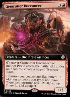 Gemcutter Buccaneer is an excellent Treasure maker, giving you tapped tokens whenever any Pirate enters the battlefield under your control. In addition, your Treasures are also Equipment that can give your Pirates a nice buff when necessary.
