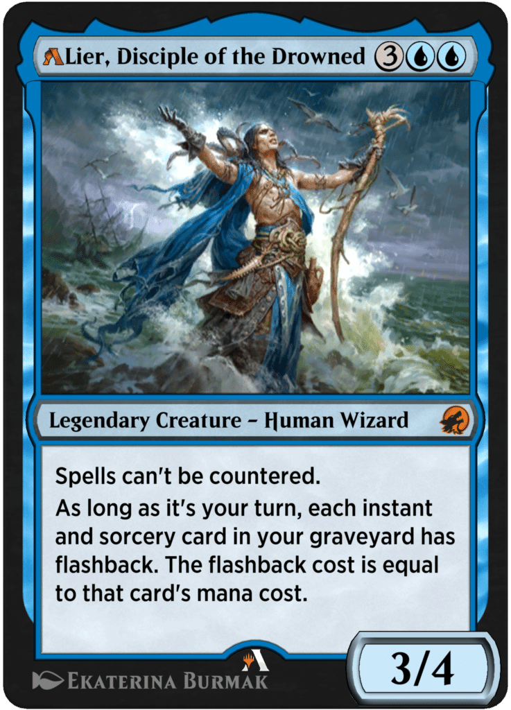 Lier, Disciple of the Drowned had a “during your turn” clause added to it’s main ability. This is a pretty big change, as you’re no longer able to use cards like Fading Hope or Divide by Zero to protect Lier, or removal spells, on your opponent’s turn. This opens up the door for opponents to deal with Lier on their turn, play and attack with creatures, and also to interact with the Lier player’s graveyard. Overall a good change
