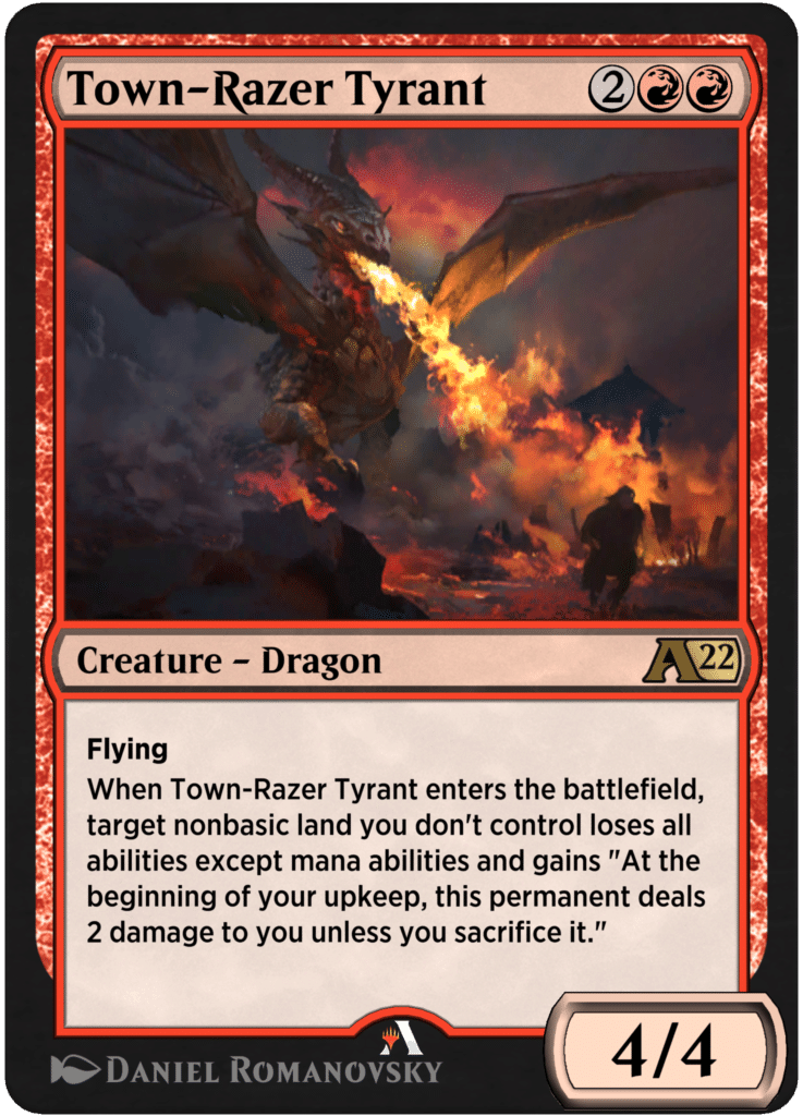 Town-Razer Tyrant had a small change adding a “non-basic” land clause to which land it could target. This really doesn’t move the needle too much, as there’s plenty of Non-basic lands in both Alchemy and Historic that are worth targeting. From creature lands to duals, there’s plenty to hit and this will still be a great card.