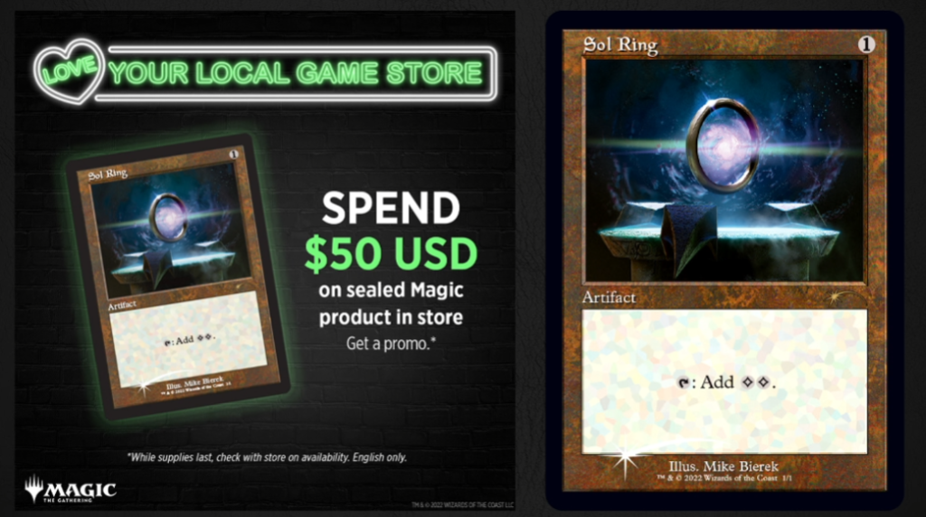First up, we have the return of the “Love Your Local Game Store” promotion. In the month of July, if you head to your local WPN store, and spend $50 on sealed Magic: The Gathering product, you’ll get this awesome retro frame Sol Ring. This promotion starts on July 1, so check with your LGS to see if they are participating in this promotion!