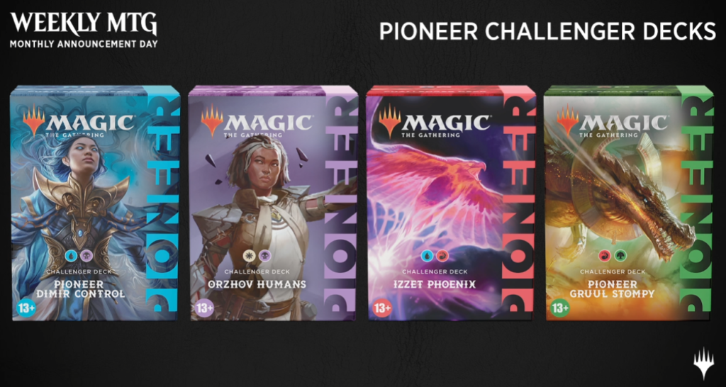 The four decks that we have here are “Pioneer Dimir Control”, “Orzhov Humans”, “Izzet Phoenix” and “Pioneer Gruul Stompy”. We don’t have the exact deck lists for these just yet, as they’ll be previewed closer to when this product launches on October 14th as well.