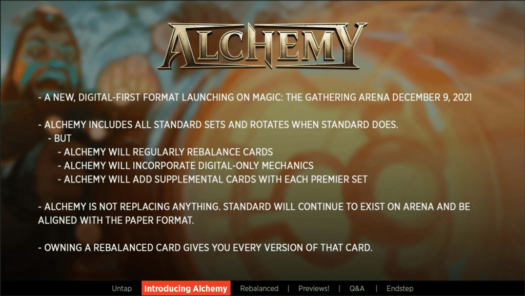 Alchemy is a digital only format on MTG Arena that will be releasing on December 9th, 2021. The card pool for the format will be the Standard card pool and it will rotate once standard rotates. There will be NEW cards added to Alchemy, and some cards that are in Standard will be rebalanced for Alchemy, but stay the same in Standard. This makes the format feel a bit closer to Hearthstone in terms of flexibility of change for these cards.