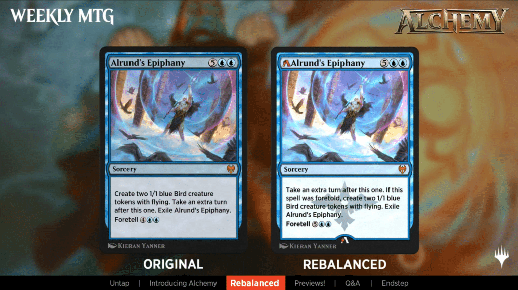 Alrund’s Epiphany was nerfed. There was a few changes here. First the Foretold cost was increased, so there’s no mana savings. Secondly the bird tokens will only be made if the spell was foretold when it is cast. If it’s copied, or cast from the hand, you won’t get the birds.