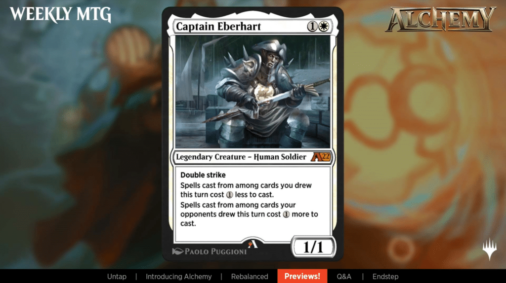 Captain Eberhart is a card that cares about spells that you and your opponent have drawn in the current turn. Yours get cheaper, and you tax your opponent’s.