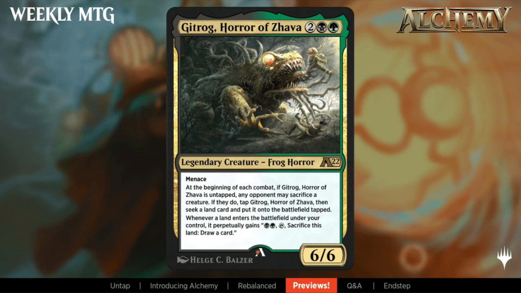 Another returning character, Gitrog, Horror of Zhava uses the Seek mechanic, and is inspired by Desecration Demon.