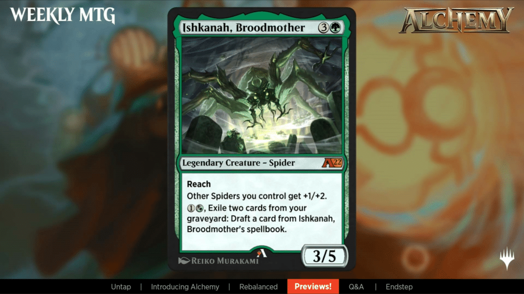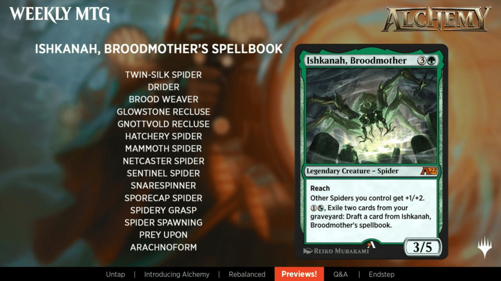 Ishkanah, Broodmother is a returning character, but a new card. She features a new mechanic, Draft. Draft will function the same way that Davriel, Soul Broker’s -2 ability, where you’ll be give a choice of 3 from a list. The 2nd picture has the full list of cards you could hit, and they’re all spider themed.