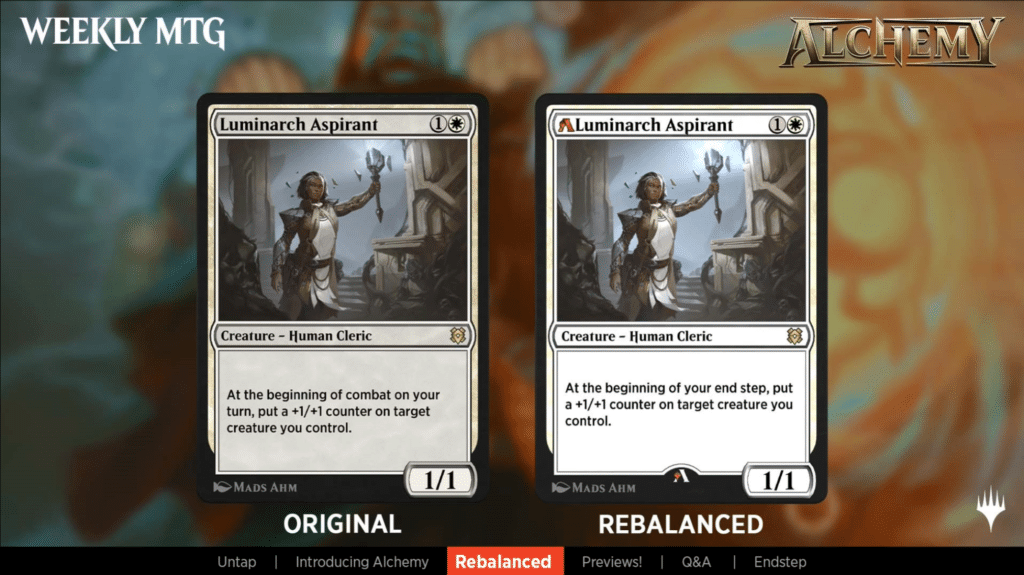 Luminarch Aspirant is being nerfed. Instead of putting the +1/+1 counter on a creature at the beginning of combat, it will happen at the beginning of your end step.