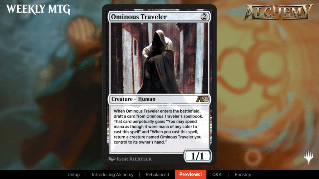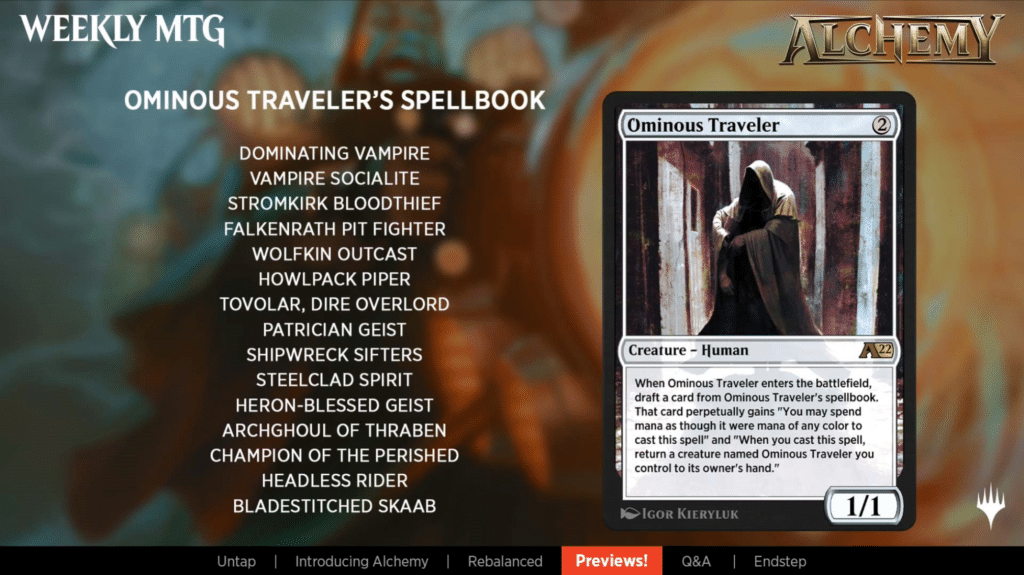 Ominous Traveler is another card that uses Draft and has a spellbook. The cards from the spell book are all new Innistrad cards, and has a bit of repetition to it as well.