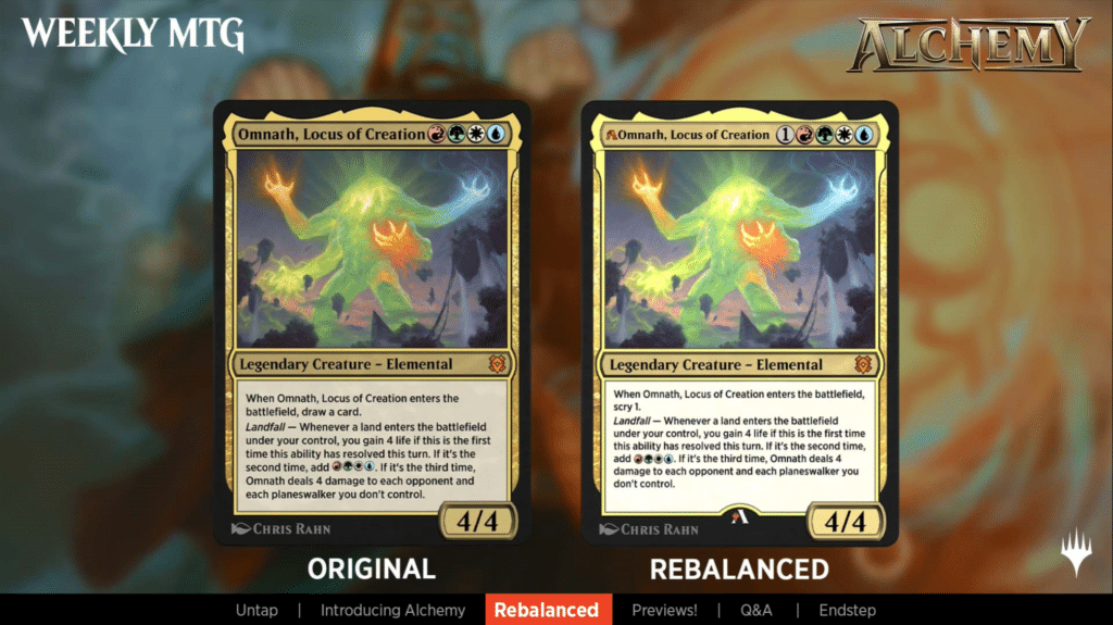 Omnath, Locus of Creation is getting nerfed (but becoming legal). It’s mana cost was increase by 1, and instead of drawing a card when it enters play, it now will scry 1.