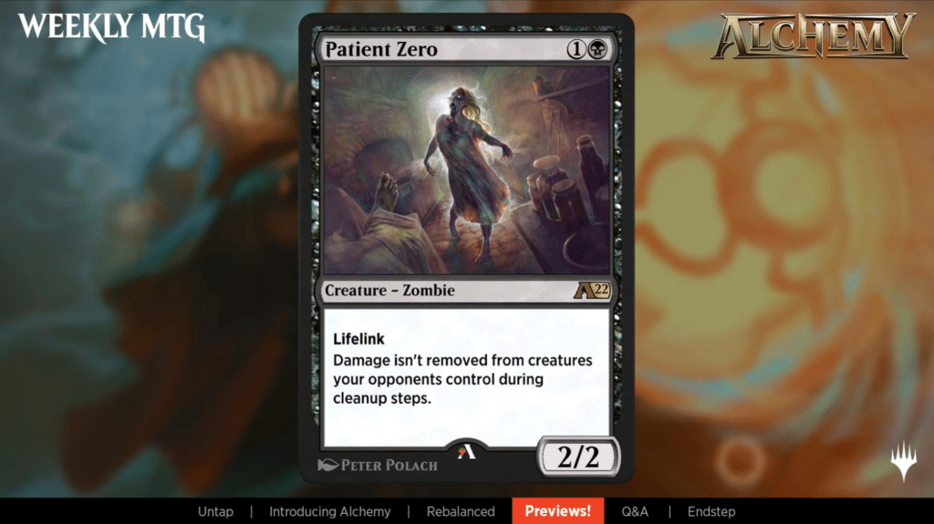Patient Zero is the first time that Wizards has considered having persistent damage on creatures. Normally damage will be removed at the end of a turn, but not with this card.