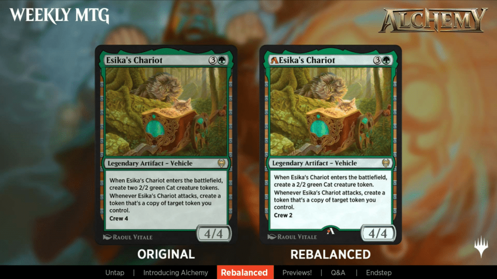 Esika’s Chariot was nerfed. Instead of creating 2 cats, it now makes 1, but it can now be crewed for 2 instead of 4.