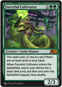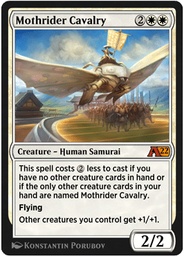 Our Mythic cycle mechanic is a cost reduction if you don’t have a specific type or card in your hand. Forceful Cultivator cares about lands, and Mothrider Cavalry cares about creatures. While the rate of these creatures without their effect is mediocre at best, for their 2 mana alternate cost, they’re quite compelling.