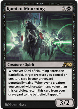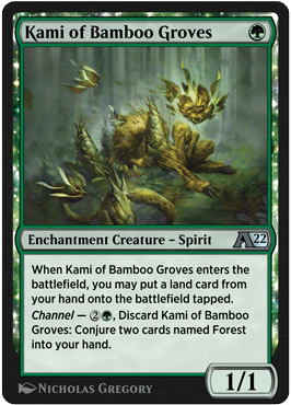 Most of the cards here are generally pretty average on their face so we’ll only hit on the notables. The first card that’s pretty interesting is the Kami of Bamboo Groves. Being an Arboreal Grazer in effect is really nice, and the ability to channel it away to create 2 Forests is incredibly beneficial for Landfall and Ramp strategies.