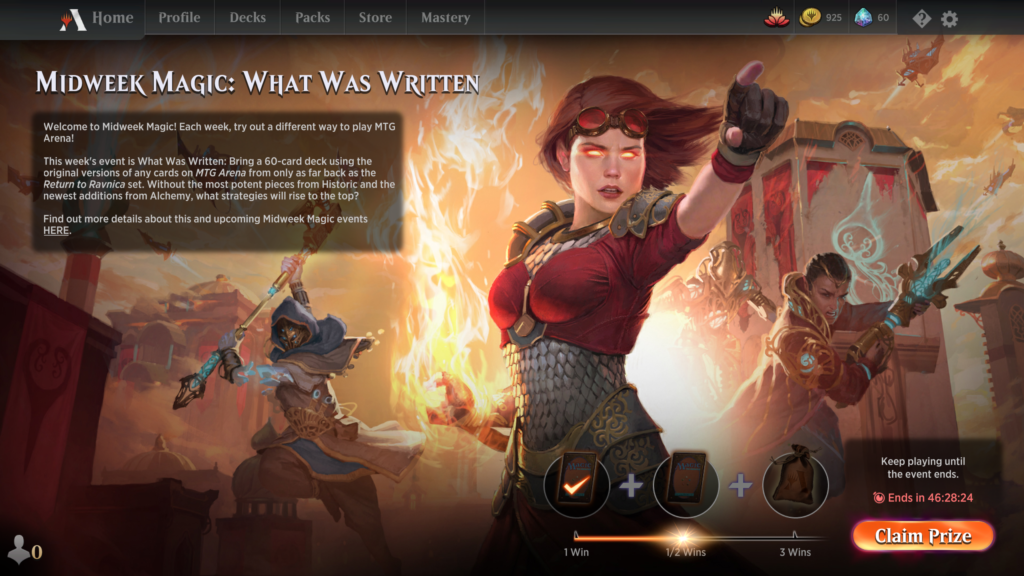 “What Was Written” is this week’s Midweek Magic format, and boy is it exciting. We’ve talked about this in the past few weeks. This format is basically Pioneer but with cards that are legal on Arena. This means no Digital cards, no cards older than Return to Ravnica. It also incorporates the Pioneer banned list. What’s nice is that we can play nearly fully complete Pioneer decks, which we’ll drop a few lists at the end.
