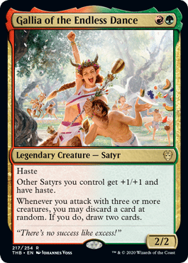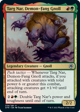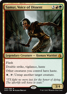 Grumgully, the Generous is one of the first creatures we want to play since that helps pump up our team even further. Mox Amber is a free legendary spell that helps us go mana positive when we play multiples of it, which can be very relevant in certain situations. Finally, we have Samut, Voice of Dissent to give all of our creatures haste, and lets us close out the game very quickly. You can play Samut, Tyrant Smasher in this spot to fill the haste enabler role, but the creatures Samut is a serious threat with double strike so having that extra fire power on board is preferred.