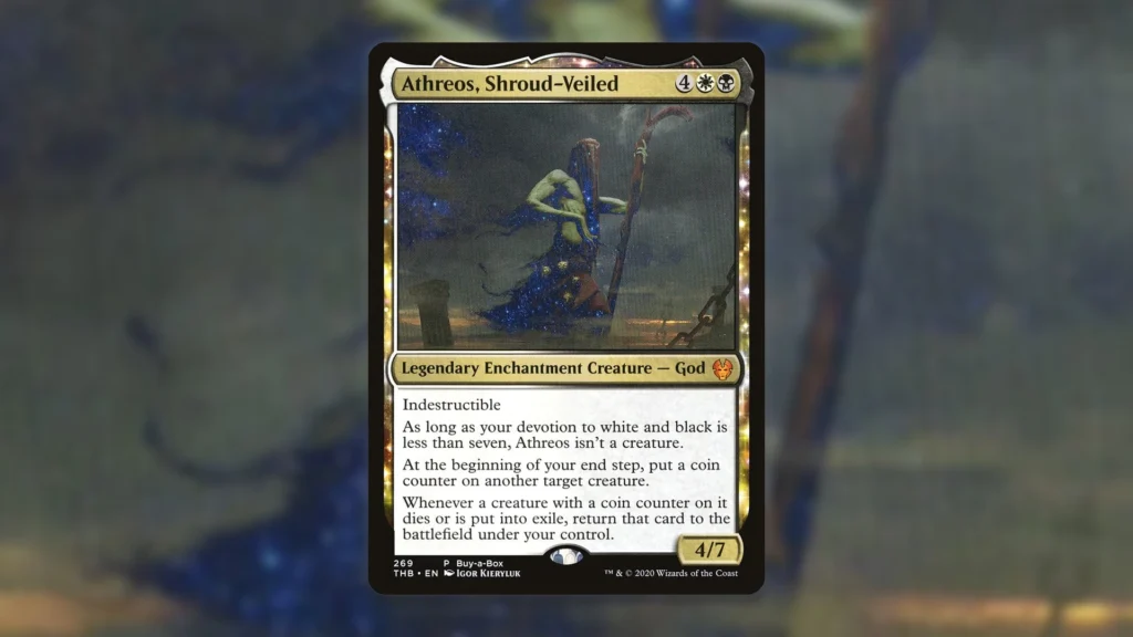 Thanks to its multitude of abilities, Athreos, Shroud-Veiled has a lot going in its favor. As an Indestructible threat, Athreos isn’t vulnerable to traditional removal spells, letting it stick around long-term to distribute tons of Coin Counters. This allows Athreos to be a value machine, consistently bringing back your biggest threats time and time again.