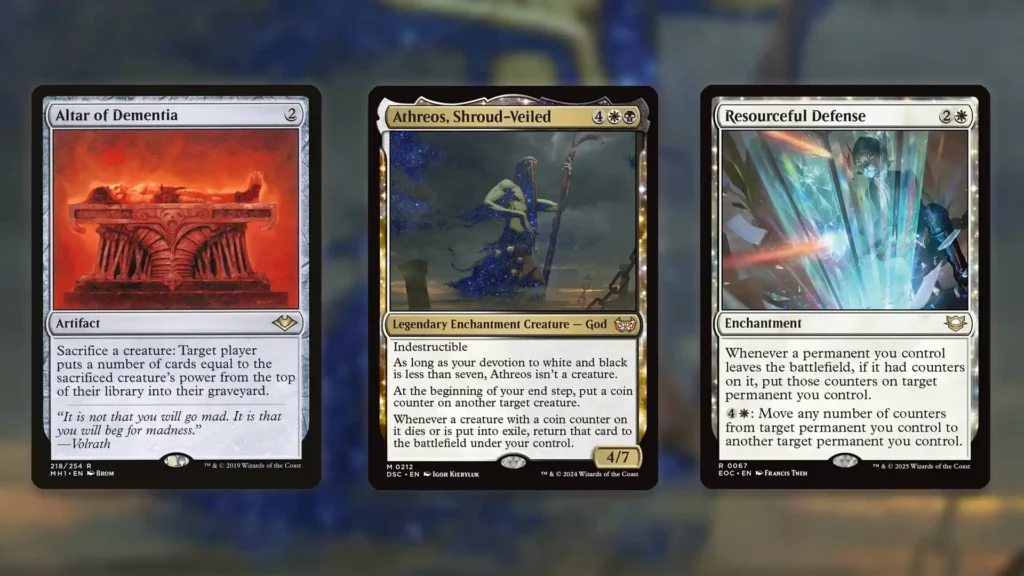 Notably, there are a lot of redundant combo pieces that can fill in for either Altar of Dementia or Resourceful Defense. Replacing Resourceful Defense with Reluctant Role Model or Enduring Bondwarden enables the same combo kill, for example. Meanwhile, substituting Blasting Station or Phyrexian Altar for Altar of Dementia will let you win by dealing infinite damage or generating infinite mana instead of Milling each opponent.