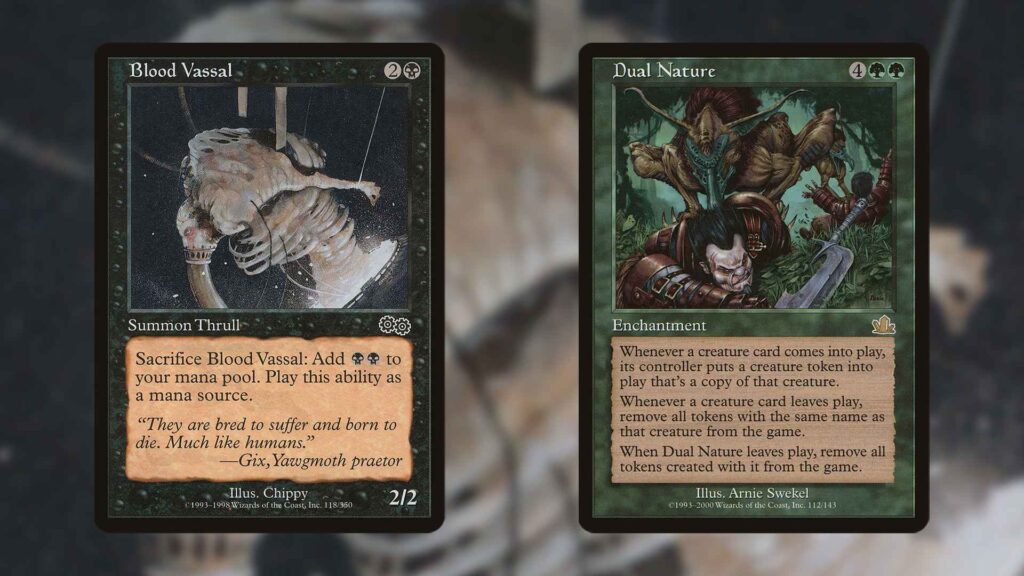 Sadly, executing infinite combos with Balthor itself isn’t something you can do in mono-black, but it is possible in Golgari. Using Dual Nature and a creature that creates two black mana, like Blood Vassal, you can create infinite black mana using resurrection loops. To pull this off, you need to cast Balthor, the Defiled after Dual Nature is already in play, causing it to trigger. After putting the original copy of Balthor in the graveyard due to the Legend Rule, sacrifice your Blood Vassal for mana. From there, activate your token Balthor’s ability, bringing back your original Balthor and Blood Vassal. Dual Nature will create copies of both creatures, allowing you to put Balthor into the graveyard and repeat the loop.