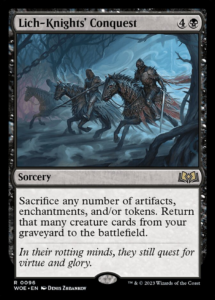 While Lich-Knights’ Conquest doesn’t have the Bargain keyword, the Wizards of the Coast employees spoiling the card admitted that it is just a mass Bargain effect. MultiBargain is definitely not a keyword yet, so writing the card like this makes a lot of sense. This is currently the only MTG card that offers Bargain in multiple instances.