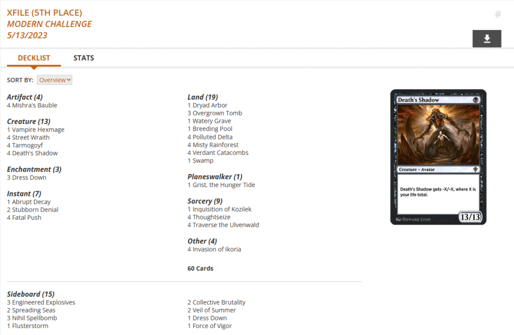 Part of the flexibility of Invasion of Ikoria is that it does not have to tutor Vampire Hexmage all the time. If you don’t have access to four mana, even searching for a Death’s Shadow can be quite effective. Sometimes you will be super light on mana, hence why the deck plays one Dryad Arbor to search for in these situations. Further, if you are in need of removal, perhaps to answer a large opposing Murktide Regent, you can even search for Grist.