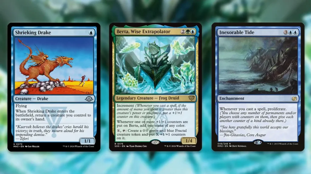 Beyond just these lethal damage kills, combining Berta, Inexorable Tide, and Shrieking Drake also sets you up to generate an infinite Storm count. Once Berta and Tide are in play, casting Shrieking Drake from your hand will trigger Tide and let you Proliferate. As long as Berta has a +1/+1 counter on it, Proliferating will let you grow Berta, creating a blue mana. You can use this to recast Shrieking Drake over and over, winning the game with Brain Freeze or Aetherflux Reservoir.