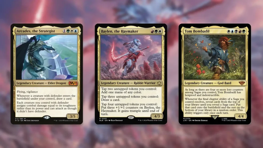 In this MTG Commander bracket, a lot of the best decks seek to overwhelm opponents with advantage. Baylen, the Haymaker is a fantastic option for this, offering tons of value with minimal required support. Alternatively, cards with incredibly strong internal synergy, like Arcades, the Strategist or Tom Bombadil, are amazing in bracket three.