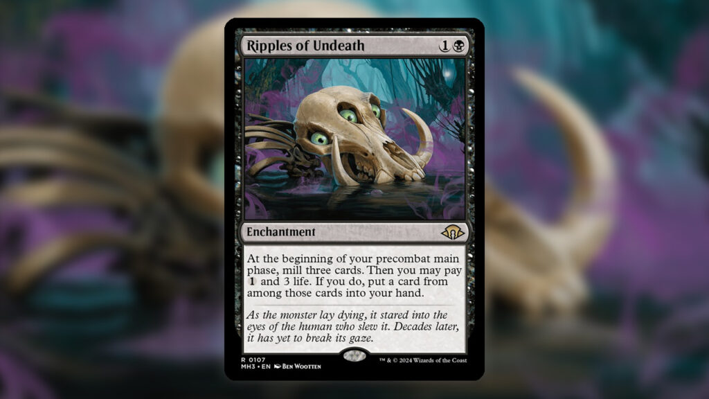 Ripples of Undeath isn’t quite as good as Sylvan Library… at least on a blank sheet of paper. In certain strategies, players may prefer the black enchantment over the green powerhouse. If your plan involves milling cards, Ripples of Undeath is tough to beat. Not only will you be fueling your primary game plan, but Ripples of Undeath also functions as recurring card advantage. Sadly, you will need to pay mana and life for this, but that is, frankly, a rather small price to pay for the amount of advantage that Ripples of Undeath provides.
