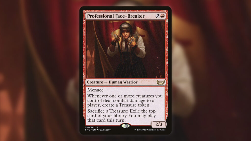 Notably, Professional Face-Breaker turning Treasure tokens into Impulse draws can be a monstrous ability when partnered with Prosper, Tome-Bound. Prosper can make a Treasure with each card you cast from the Facebreaker’s ability, which can then offer more Treasure Tokens, and can be used to either cast more spells or exile more of them.