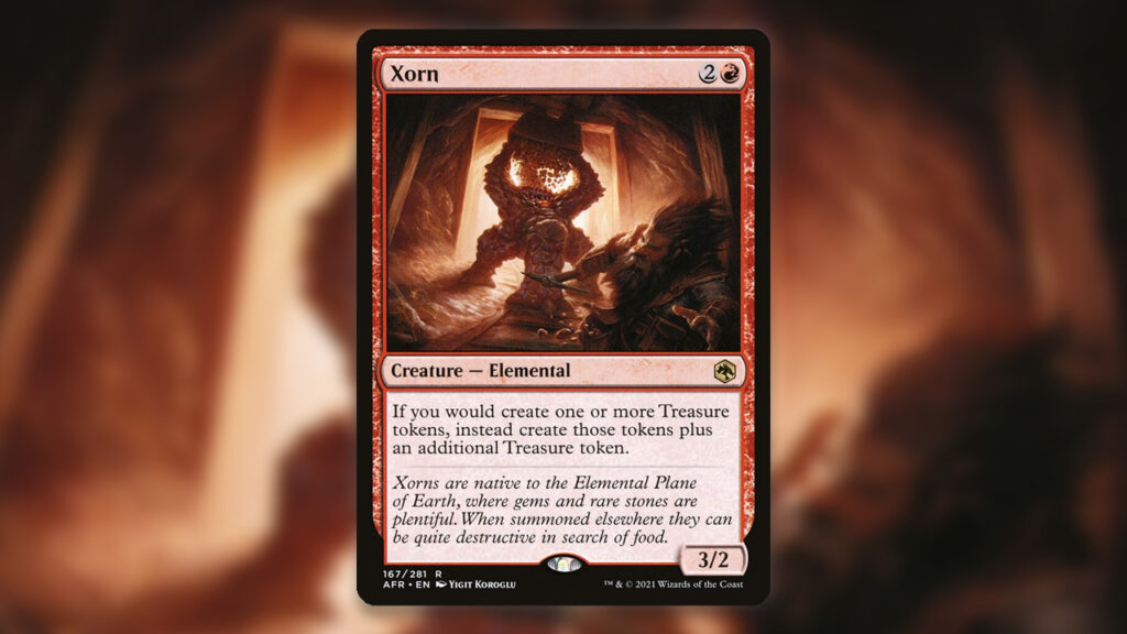 Xorn offers Treasure players an ability that all Commander players love: replacement effects that create more tokens. Unlike many of the other replacement effects that could copy Treasure Tokens like Doubling Season, Parallel Lives and Anointed Procession, Xorn’s color identity matters more than it may seem. A disproportionate number of Treasure cards are in red, so having Xorn’s color identity be that of a majority of the other Treasure Token cards’ makes it worth mentioning. Xorn, however, does not double tokens – it simply adds one more.