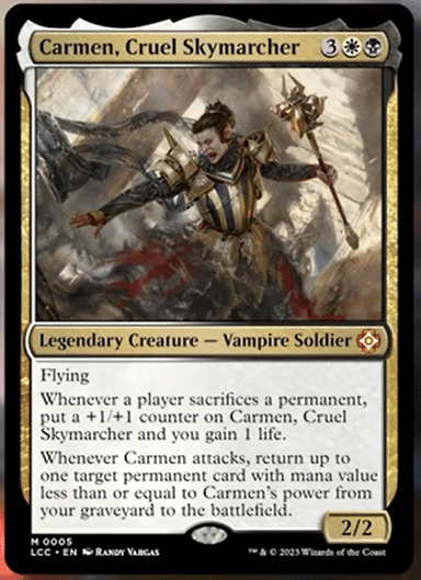 Carmen, Cruel Skymarcher is an interesting potential Commander that really cares about sacrificing. They grow whenever anyone sacrifices permanents, which makes universal sacrifice effects like Fleshbag Marauder quite powerful with this Commander. Growing Carmen from a 2/2 to a 6/6 with just one removal piece is impressive.