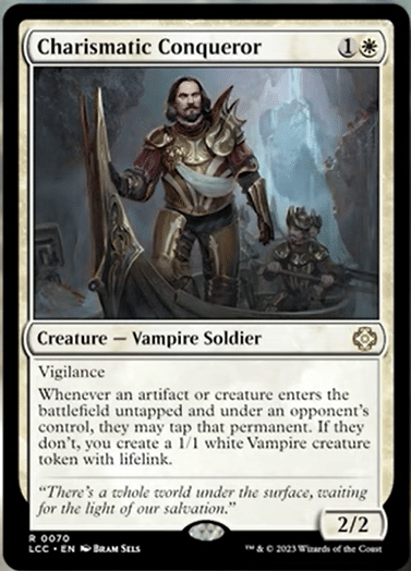 Charismatic Conqueror, for two mana, is a great deal. The Vampire creature either functions as a Blind Obedience or, if your opponents really need to have their early mana rocks enter untapped, the Conqueror threatens to make a ton of tokens.