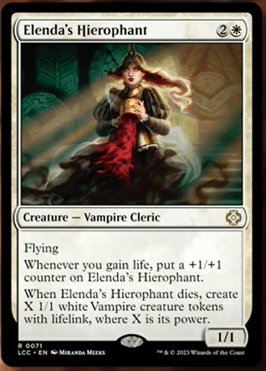 Affectionately named after Elenda, the Duskrose, Elenda’s Hierophant synergizes well with the typical 1/1 Lifelinking Vampire tokens. That said, lifegain appears to be a side synergy to Blood Rites, and Elenda’s Hierophant wants it to be the main focus.