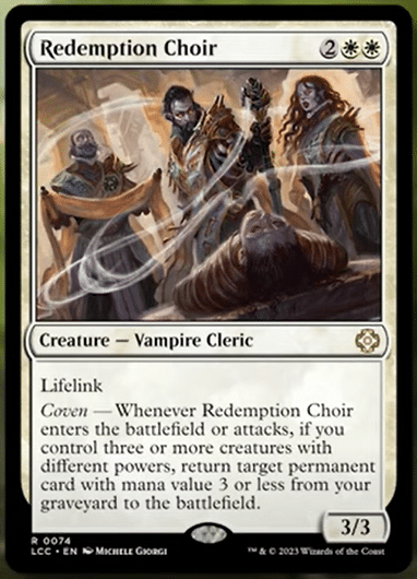 Redemption Choir does not seem worthwhile. Coven demands more setup than it may seem and the payoff to set this up and get an attack off without an opponent removing something is lackluster. Reanimating a creature with mana value three or less can be accomplished much more easily and, while the choir’s payoff can be hit multiple times as long as Coven is set up, one board wipe undoes all of your efforts. This feels like a win-more card to me that doesn’t do enough on its own.