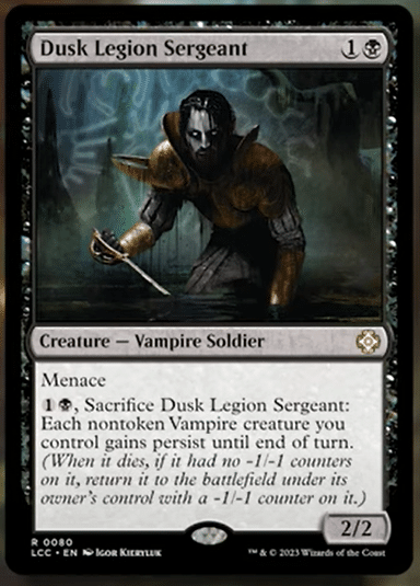 If you can find a way to sacrifice and recur the Dusk Legion Sergeant, it can also give itself Persist. It may be more work than its worth, but if you can reanimate the Sergeant to its own ability and clear the -1/-1 counters on your Persisted creatures, you could create a very sticky board.