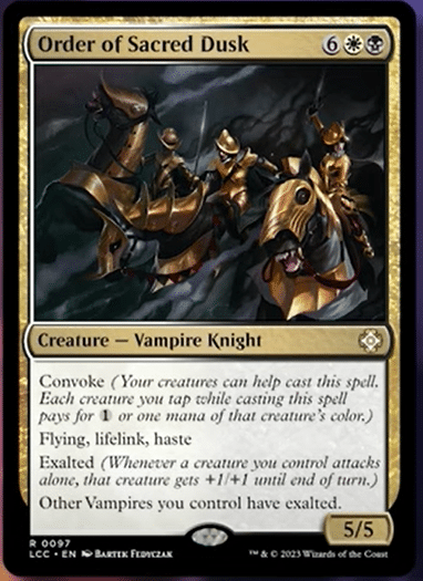 Order of Sacred Dusk is yet another card that will likely only see play in Vampire Typal strategies. This is a rather unique card that synergizes well with Vampire token decks that want to go wide. Granting all of your tokens Exalted means that Order of Sacred Dusk hits like a truck. If you can cheat this out quickly, the Order can gain you a ton of life.
